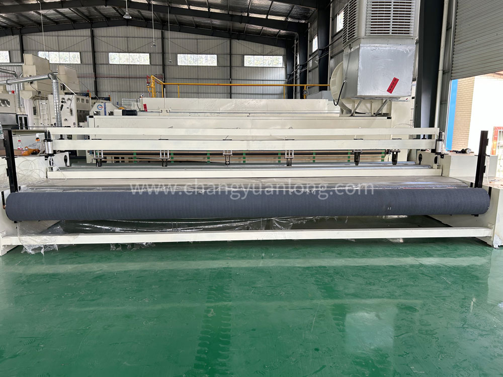 5. CYLPW-2200铺网机:机架采用6mm钢板折弯而成,铺网帘之间加补偿电机,减少纤网牵伸。往复换向用变频控制,冲击力小,能自动缓冲平衡换向,并配有多段速控制。底帘可调节升降,使棉网能按照所需要的单位克重均匀铺叠到底帘上,供下一道工序使用。斜帘﹑平帘和大车平帘用高档优质皮帘,底帘和环帘为木帘子。